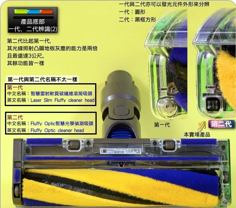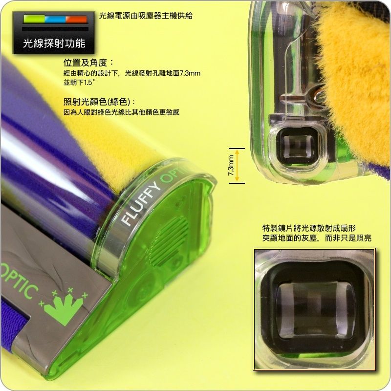 精心設計的放射角度及高度: 經由透鏡將雷射光放射成扇型。並經詳細研究後,以最適合看到微塵的角度(水平向下1.5度)及高度(距離地面7.3mm) 放射出去,讓微塵無所遁形。 綠色雷射光: 人眼對綠色雷射光特別敏感,視覺上比其他顏色更亮更顯眼,可以增強對比度,使隱藏的灰塵清晰可見。 易於維護: 側蓋可以容易地用手扳開,並取下滾筒清洗維護。 輕巧的吸頭: 本吸頭由高強度ABS製成,強韌耐用又輕巧。滾筒上的軟質尼龍絨毛可捕獲大型碎片,其上的黑色抗靜電碳纖維刷毛可以清除微塵。 本吸頭僅重420克,比傳統的軟質碳纖維吸頭(764克)輕上40%,長時間使用也不容易累。 第二代產品: 第二代比起第一代,其光線照射凸顯地板灰塵的能力是兩倍,且最遠達3公尺。其餘功能皆一樣 其他注意事項: 第一代與第二代名稱不太一樣 第一代: 中文名稱:智慧雷射軟質碳纖維滾筒吸頭 英文名稱:Laser Slim Fluffy cleaner head 第二代: 中文名稱:Fluffy Optic智慧光學偵測吸頭 英文名稱:Fluffy Optic cleaner head