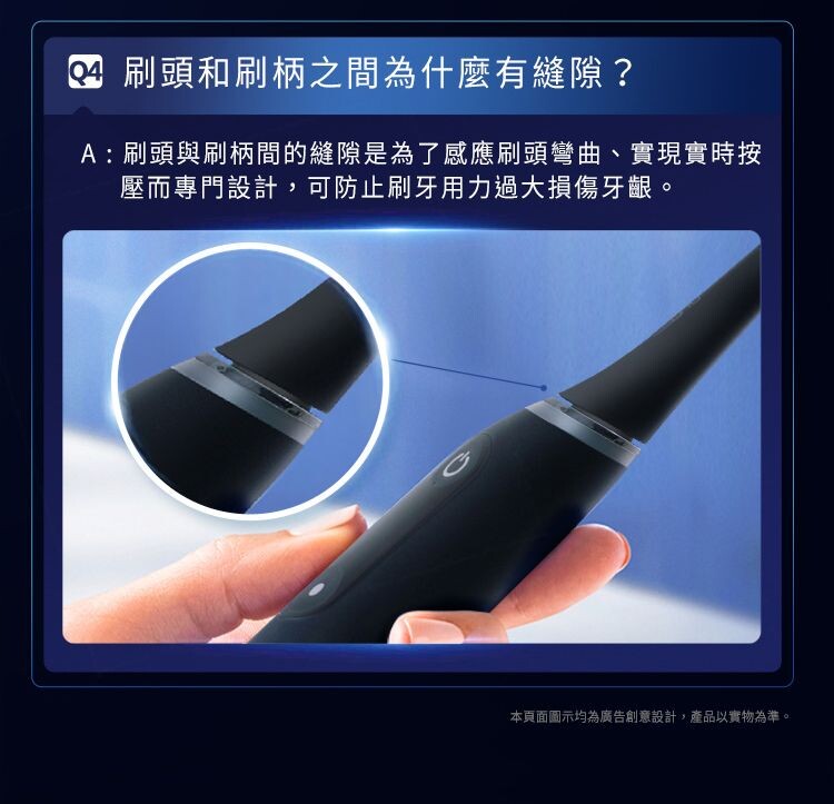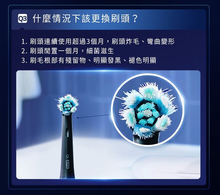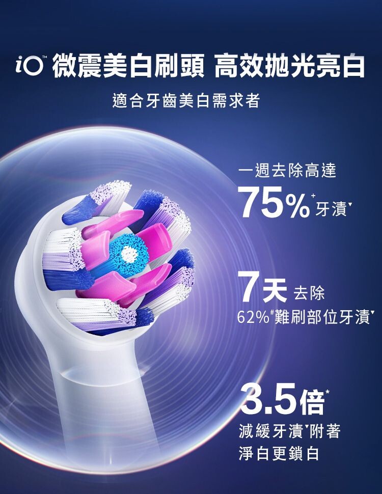 Oral-B iO極柔清潔護齦刷頭, 超過4000根經過細心磨圓處理的刷毛, 溫和高效清潔牙齒及牙縫。 外圈超細刷毛, 如氣墊般溫和清潔, 呵 護敏感牙齦; 凹凸曲面刷毛 同時貼合齒面弧度, 帶來絲滑柔和的超潔淨體驗。